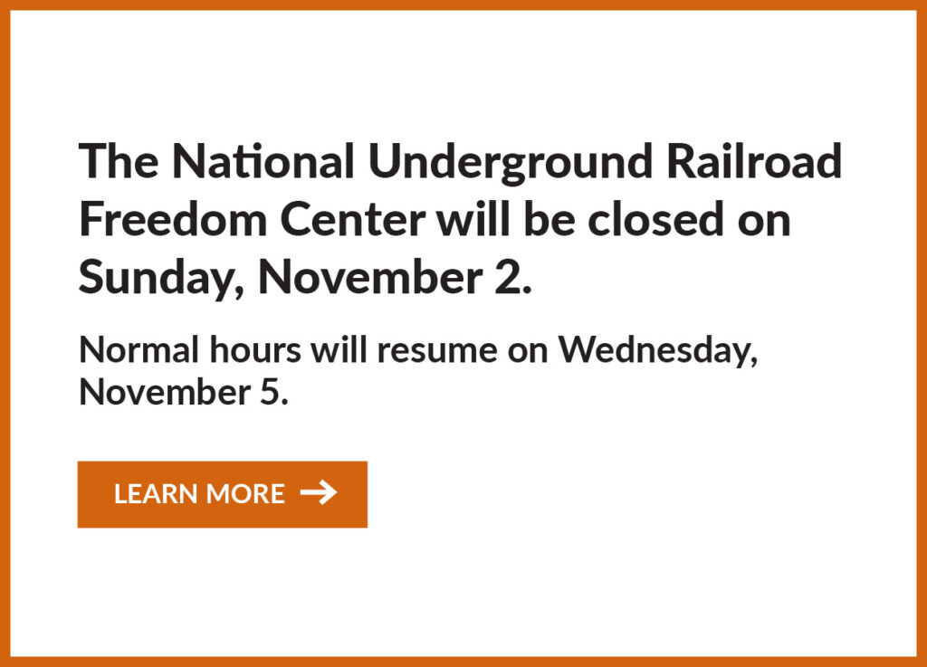 The National Underground Railroad Freedom Center is open Sunday-Monday from 12:00 p.m.-5:00 p.m. and Tuesday-Saturday, 10:00 a.m.-5:00 p.m. For more information about exhibits and programming at the National Underground Railroad Freedom Center, visit freedomcenter.org.